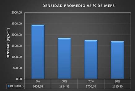Para la dosificación C con un 70% de MEPS se determinó según los ensayos en el laboratorio que cumple con la resistencia compresión de 17,25 Mpa y una resistencia a la tracción de 1,76 Mpa, con una densidad inferior a 1800 kg/m³.